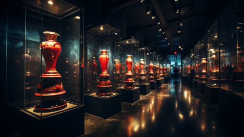 A hall of fame dark room with dynamic lights that are showcasing a close up five glass displays, every display includes of one jersey EUROPEAN SOCCER TEAMS, cinematic, dynamic, hyper realistic, 4K, --s 750 --ar 16:9