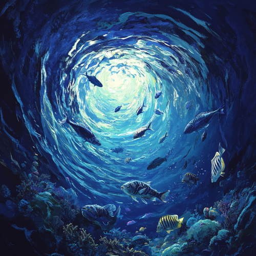 Underwater sea scene from a bottom view showcasing vibrant fish shoals, dynamic vector background with a clearly defined vortex, illustrating the cycle of fish life from circulation to rebirth, mesmerizing sight, highlighting the beauty and diversity of marine life