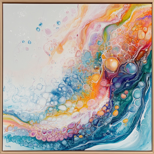 Abstract art painting of an underwater scene with gemstones, in the style of abstract expressionism, featuring pastel colors, a white background, and a wooden frame. The painting showcases visible brush strokes and textures, with swirling patterns and vibrant hues that create the illusion of water flowing around colorful rocks. The soft lighting highlights the textured surface, adding depth and dimension to the artwork