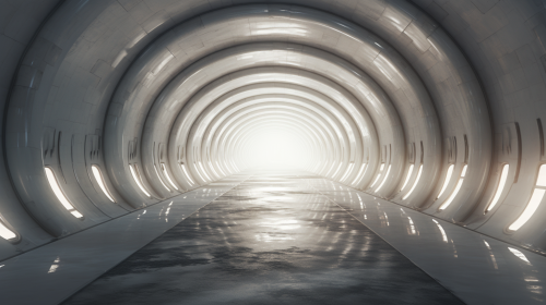 A concrete sewer tunnel, in the style of thin steel forms, glazed surfaces, in the colors of white and gray, rendered in Cinema 4D --ar 16:9 --v 5.2