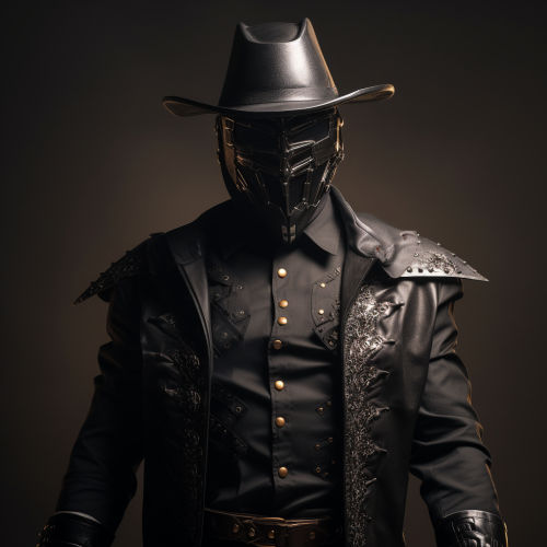 futuristic cowboy in armored, black, military uniform with blank obscure face. Cowboy hat. Full body. Plain background. Military medals.