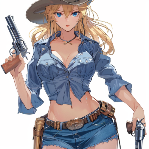a gunslinging cowgirl. Wears a denim dress, with 2 pistols on her hip. She has blonde hair and blue eyes. Wearing a cowboy hat. portrait realism style