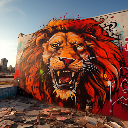 graffiti of lion in bold oranges and reds on distant wall of large dirty busy city, direct sunlight, city scenery, photography, skyscrapers in background