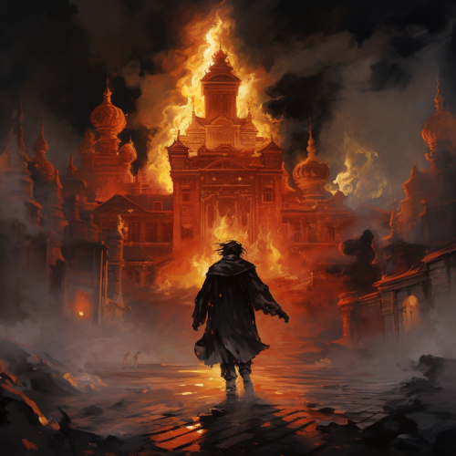 Illustration, brush painting, dramatic scene, cossack man with flowing black cape and wearing 17th-century clothing walking into a burning palace at night, the palace is massive, Elizabethan Baroque architecture, nightime