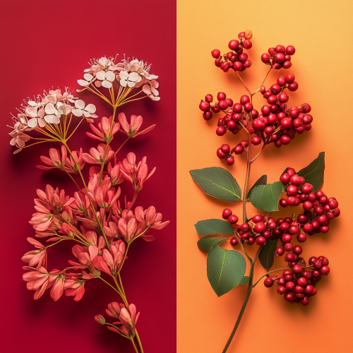 An ultra-realistic 8k photo featuring a combination of Red Clover flowers and Schizandra berries, meticulously detailed to showcase their natural beauty. The Red Clover flowers, with their delicate pink petals, are paired with glossy, vibrant red Schizandra berries, creating a harmonious and visually striking composition. These natural elements are set against a vibrant orange background, which provides a bold and eye-catching contrast. The soft, warm lighting enhances the colors and textures, making the image feel fresh, inviting, and full of life. The overall style is bright and consistent with the organic, vibrant aesthetic, highlighting the health and well-being benefits of these natural ingredients.