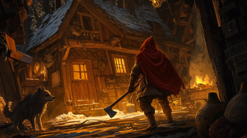 A heroic hunter bursts into the cozy cottage, axe in hand, as Little Red Riding Hood watches from the corner. The wolf is caught by surprise, creating a moment of action within the warm, rustic setting of the cottage. The lighting is soft, with a subtle glow highlighting the hero, evoking the feel of 1980s heroic tales. --ar 16:9