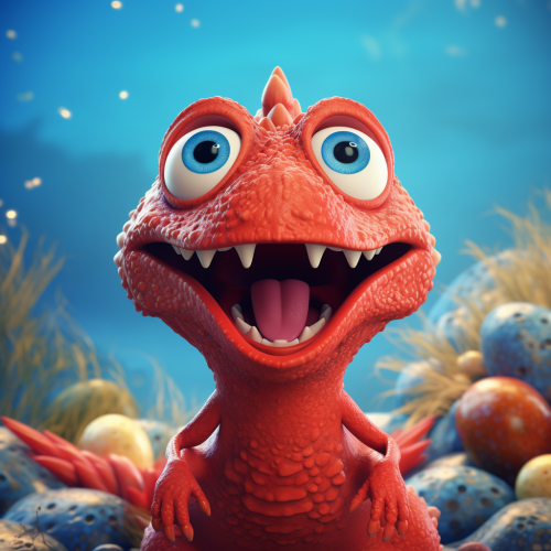 Clay animation, cute red child dinosaur (tyrannosaurus) with big eyes, mouth slightly open, looking up and smiling, adorable expression, cute red child dinosaur (tyrannosaurus) with big eyes, blue glowing jellyfish and Jupiter in background, --v 5.2
