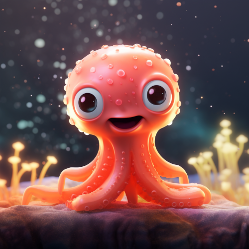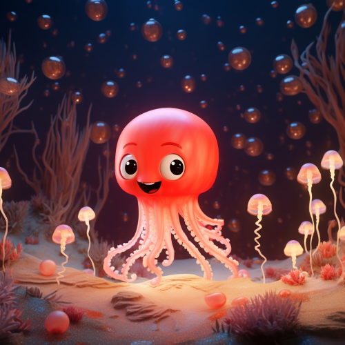 Clay animation, blue glowing jellyfish 🪼 and Saturn 🪐 in background, Cute red child dinosaur (Tyrannosaurus) with big eyes, mouth slightly open, looking up and smiling, adorable expression, cute red child dinosaur (Tyrannosaurus) with big eyes, jellyfish and Jupiter glowing blue in background, --v 5.2