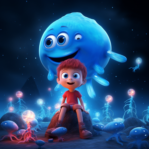 Red dinosaur admiring glowing jellyfish while Saturn watches.