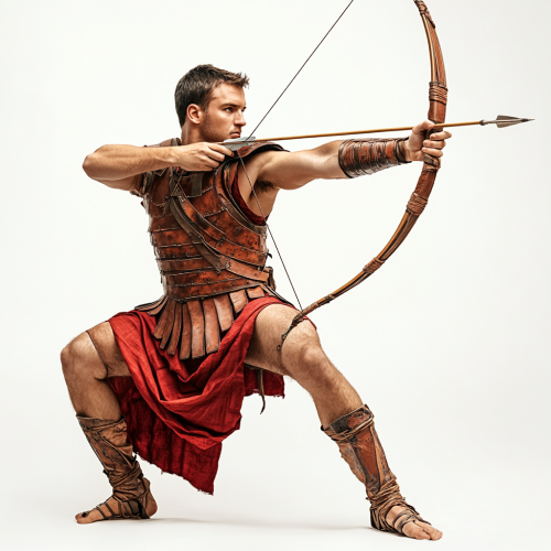 very realistic photo full body shot of ancient roman army archer, no armor, red tunic, beautiful bow and a quiver with arrows in it, white background.