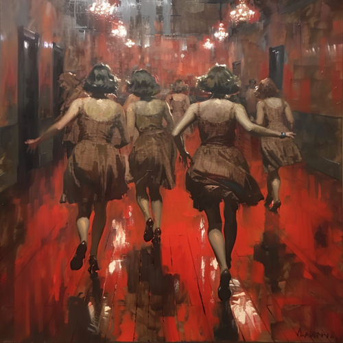 painting of 1930s caberet, Reginal Marsch, seedy, red lights, dancing girls
