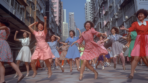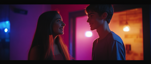 Young girls and guys are dancing at a disco party, having fun and smiling. Cinematic lighting. Super realistic. Taken on a cine camera with a 35mm lens. --ar 7:3 --s 50