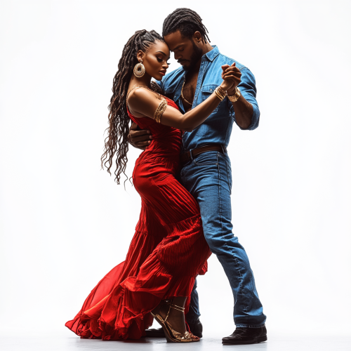 black man and woman dancing together, he is wearing blue jeans, she is in red, gold jewelry accents, lyrical romantic powerful dancing against white background, realistic high resolution photoshoot --s 250