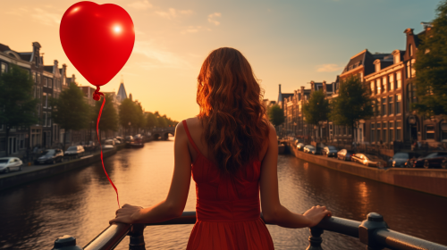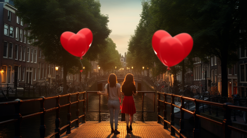UHD photo summer late evening Amsterdam Red Light district bridge two woman with balloon --ar 16:9