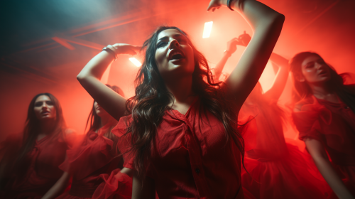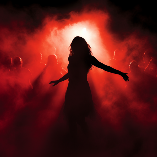 **Closeup realistic image of black silhouette of people dancing close together trance and downtempo music. The air is full of mist. The light is red an positioned on the sides of the girl. No Windows.