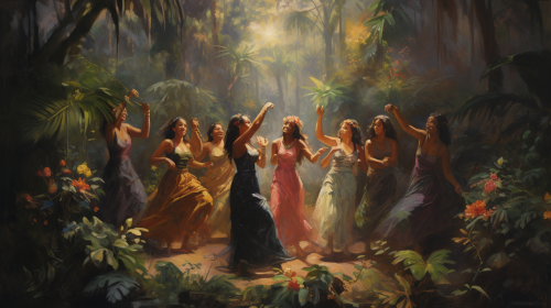 a group of frinds with girls in dresses dancing int the jungle --ar 16:9 --v 5.2