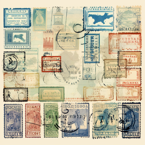 A4 border of stylized passport stamps and visas from various countries, digital art, symbolizing international travel and migration. Vintage look, detailed.