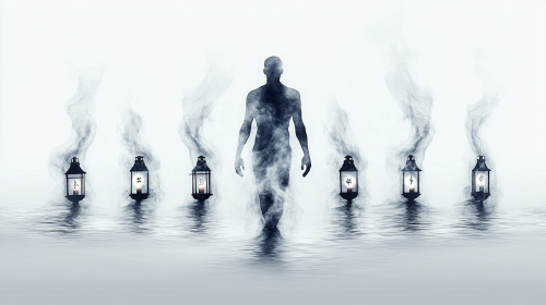 Render soft ink wash ripples with barely visible lantern shapes within. The lanterns carry faint symbols, making them appear as if they’re fading into the background, representing a spirit’s journey --ar 16:9 --v 6.1 --s 200 --c 30 --p ygc51sj