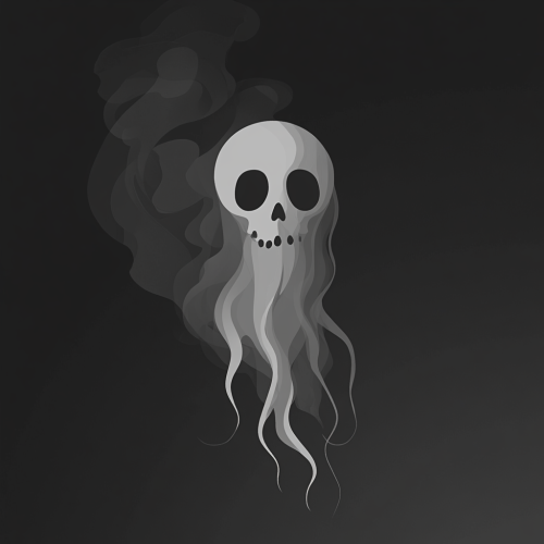A flat, 2D illustration of a ghostly skull, partially dissolving into mist, in two shades of gray and black. The skull has hollow, haunting eyes, with simplified, smoky tendrils flowing upward, blending into a dark background. Minimalistic design, emphasizing strong contrast and shadow. The image captures a dark, eerie presence with a simple, bold compositio