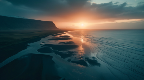 Icelandic nature drone shot at dawn in the autumn, cold tones, low contrast, leica m6, sparse, depht of field --ar 16:9 --v 6.0