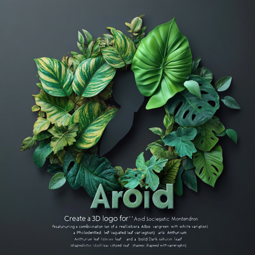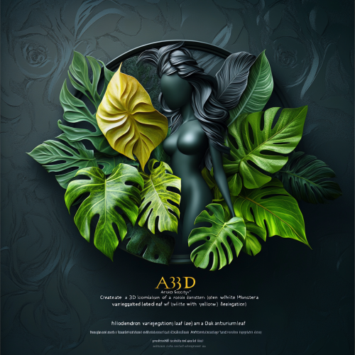 "Create a 3D logo for 'Aroid Society' featuring a combination of a realistic Monstera Albo variegated leaf (green with white variegation), a Philodendron Dragon variegated leaf (deep green with yellow variegation), and a bold Dark Anthurium leaf (shaped like an Ace of Spades, deep green to almost black). The woman’s silhouette is positioned in the center, holding or cradling the circular frame that the plants extend from. The silhouette should be minimalist and elegant, with the leaves radiating outward, creating a balanced and organic design. No text, and provide the logo as a transparent PNG image." --s 250