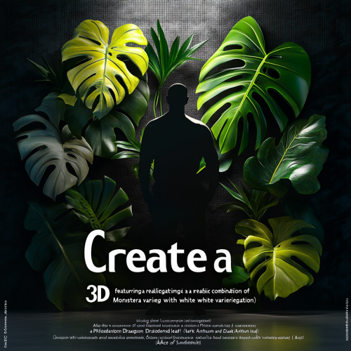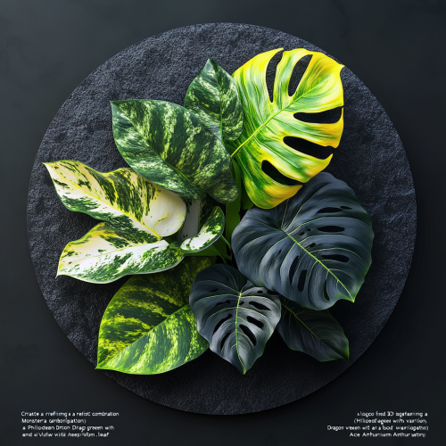 "Create a refined 3D logo featuring a realistic combination of a Monstera Albo variegated leaf (green with bright white variegation), a Philodendron Dragon variegated leaf (deep green with vivid yellow variegation), and a bold Dark Anthurium leaf (Ace of Spades-shaped, nearly black with dark green hues). The figure should be a faceless guy with natural skin tones, subtle and sophisticated clothing, in different elegant poses--such as standing, gently holding the plants, or cradling the circular frame. The face should not be shown, keeping the focus on the plants and pose. Avoid any cartoonish elements, ensuring the design appeals to a 25-45 age audience. No text, and provide the logo as a transparent PNG image." --s 250