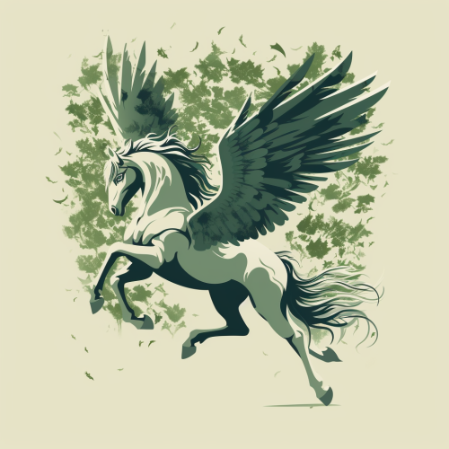minimalist 2d vector of a broken up pegasus silhouette surrounded by green leaves and vines