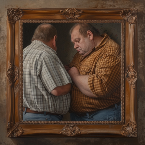 fat middle aged # man starring at his shameful reflection in the mirror. Human, realistic, 9:16 --v 6.0