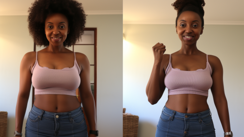 African American woman transitioning from being overweight to lightweight. Show multiple images of her weight loss transition., Point-of-view perspective, DSLR camera, Character shot scene