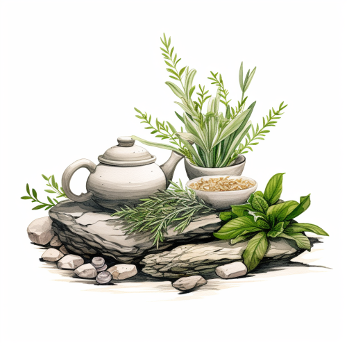 Create a detailed fabric design showcasing a thriving herb garden with rosemary, thyme, and sage sprouting from antique pots. The herbs curl into intricate spirals, surrounded by butterflies and dragonflies in pastel tones