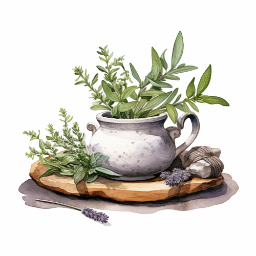 Illustrate a magical herb garden with finely detailed lavender, rosemary, and thyme plants, accented by butterflies and tiny songbirds. The herbs grow from rich soil into elegant spirals, intertwining with geometric forms that evoke a sense of mystery