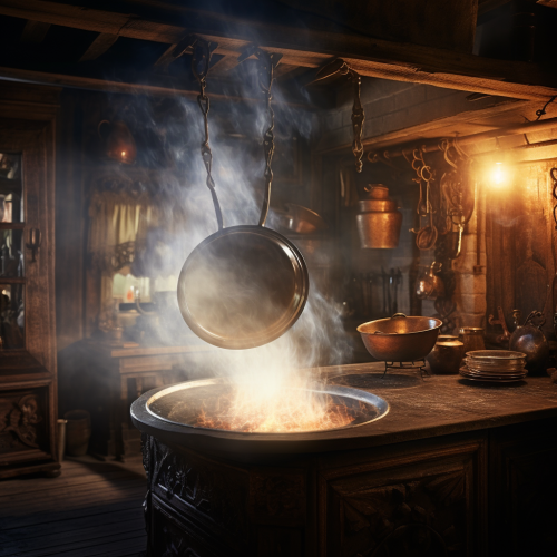 a frying pan held by an invisible ghost in midair in a medieval kitchen