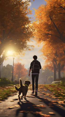 realistic, personality: [Show Alex jogging in the park, not checking his time but enjoying the run with Max, who is playfully chasing leaves. Alex stops, catches his breath, and looks up at the sky with a smile, feeling genuinely content for the first time. Max barks in agreement] unreal engine, hyper real --v 5.2 --ar 9:16