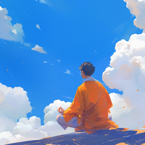 Digital painting + brushes + a man seating on the clouds doing meditation with saffron outfit, some little clouds color the deep blue sky, brightnned by the shinning sun.--ar 3:2 --niji 6