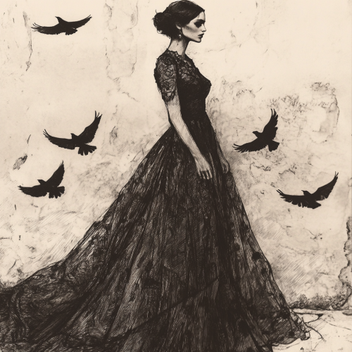 Illustrate a solitary woman standing against a plain wall, wearing a dramatic, flowing gown in the style of Edward Gorey. Use detailed cross-hatching to bring depth to her dress and to create subtle shadows around her, emphasizing the texture and volume of the fabric. Design her with a simple, emotionless expression and a statuesque posture, evoking a sense of stillness and detachment. Surround her with symbolic black bird silhouettes, carefully positioned around her to convey an atmosphere of quiet tension. Keep the background minimal, allowing the empty space to enhance the scene's sense of isolation and mystery, while staying true to Gorey's eerie, minimalist aesthetic.