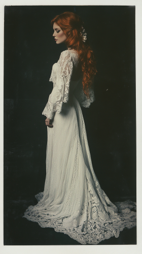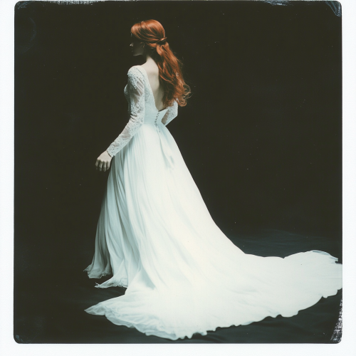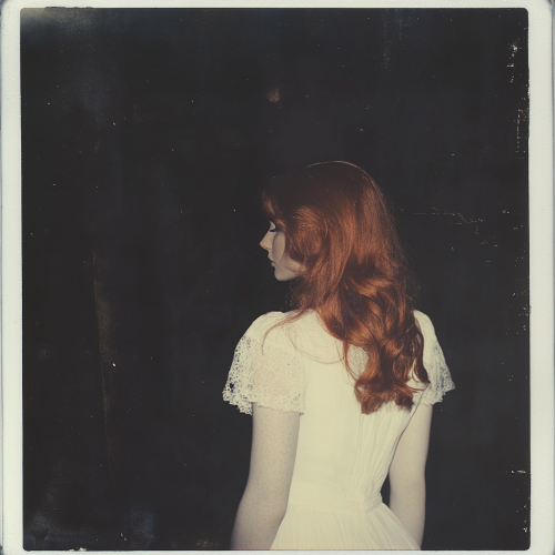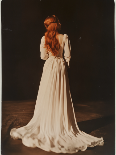 vintage Polaroid photograph of a full body very beautiful red hair woman in white gown, black background, white light, photorealistic, grainy photograph, Polaroid photograph --ar 9:16