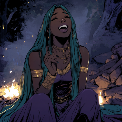 webcomic style a black woman with long straight teal hair wearing a dark purple and gold princess gown, looks scared, tangled, at a camp with a campfire, sitting, laughing, enchanting lighting