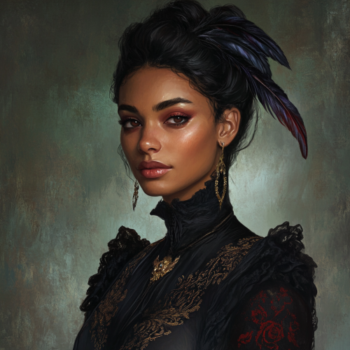 dnd ravenloft barovia renaissance gothic, character portrait, late 30s dark-skinned slavic woman, raven feathers in her hair done in a bun, innkeeper's wife, renaissance oil painting style