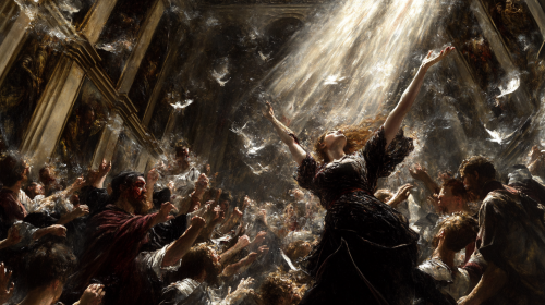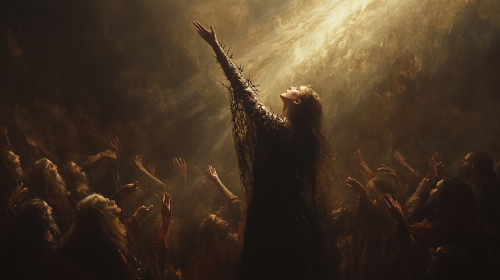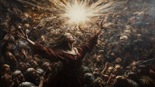 highly detailed renaissance painting. A women is standing in the middle of a crowd, her right arm reaching for the sky, her clothes are thorn and a beam of light is on her like she would be ascending in the sky. --ar 16:9
