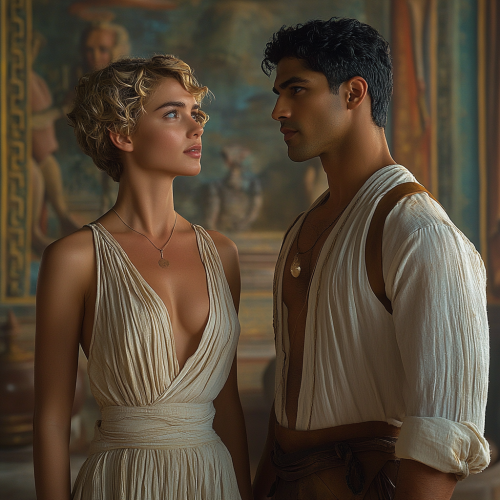 realistic movie still of a young woman with short blonde hair, blue eyes, and tan skin in a loose grecian inspired white gown facing a muscular man of pubjabi heritage with black hair and a strong facewho is wearing a white shirt and brown pants, medieval tropical palace setting --s 250