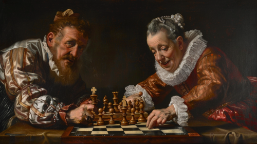 man and woman playing chess together, upper society, 1500's or 1600's, boroque painting, warm and dark, classical art style --ar 16:9