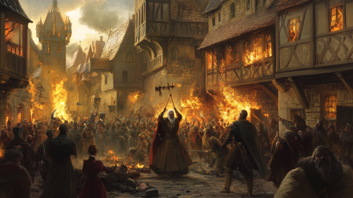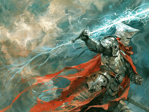 An armored wizard shoots a blast of aqua colored lightning that arcs through the sky, wearing silver armor under a red cloak, Renaissance oil painting ukio-e art style --ar 4:3