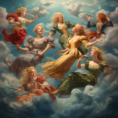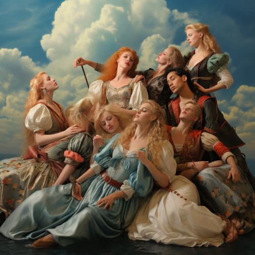 a dozen beautiful blonde women, wearing beach attire, swimming in the sky amongst the clouds, in the style of a renaissance painting