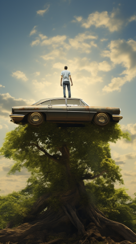 a man standing on top of a car to reach something above the tree, outdoor sunlight, hyperrealistic, realistic, --ar 9:16