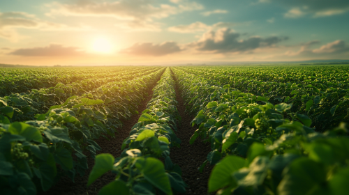 beautiful perfect and symmetrical soybean plantation, side view like a wall of plants, full image from the ground to the horizon, beautiful sky, very full and growing plantation, late afternoon light, no specular points, cinematic finish --ar 16:9 --s 250