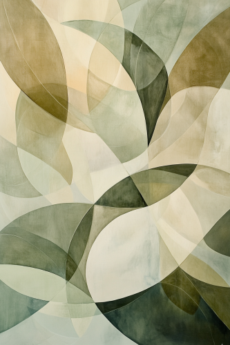 Create an abstract canvas inspired by natural forms like leaves, water, and clouds. The shapes should be organic, with flowing curves that overlap and blend gently into one another. Use a calming color palette of pale greens, soft taupes, and warm sandy tones. The overall composition should evoke a sense of peace and grounding, perfect for a serene, nature-inspired interior. --ar 2:3