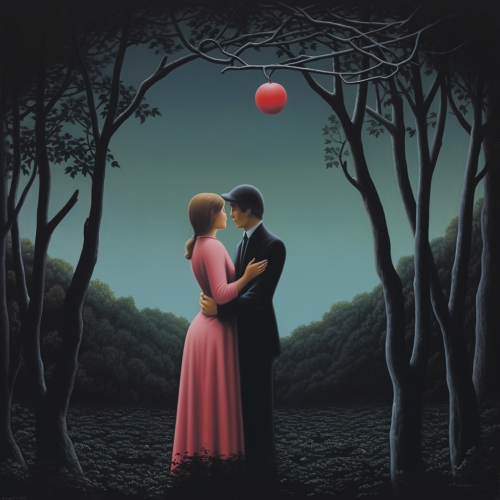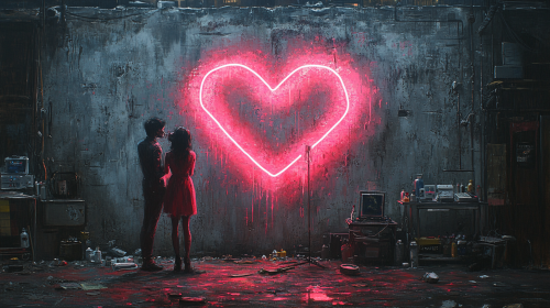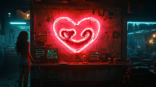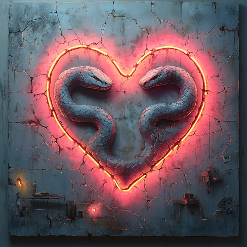 Surrealist painting in the style of Rene Magritte, featuring a gray, cracked concrete wall illuminated by pink and sky-blue neon lights, graffiti of two snakes biting each other's tails forming a heart-shaped border, scattered medical equipment around, faint cityscape in the background, dark night sky --ar 16:9 --s 750