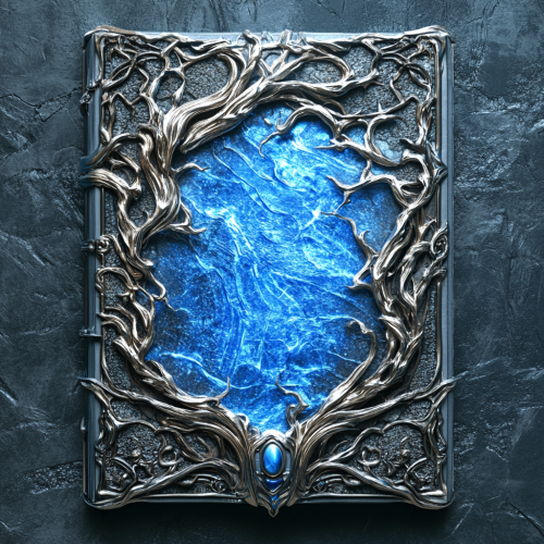 a book cover with a silver mirror, mist art of illusion, featured on art station, made in 2019, illusions, silver and blue color schemes, mind-breaking, identical picture, art for the game, insane intricate, stylized border --v 6.1