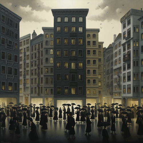 a group of people are surrounded by buildings with black umbrellas, in the style of robert bissell, haunting figuratism, rene magritte, punctured canvases