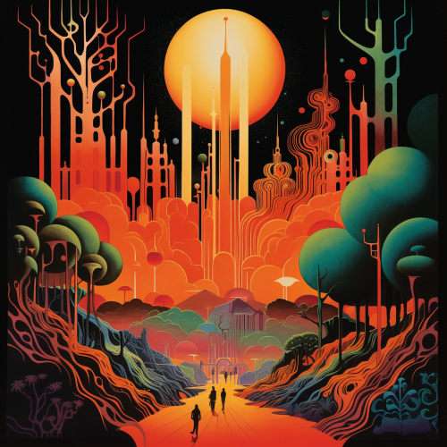 70s abstract retro patterns against a black background using blue, red orange and tan